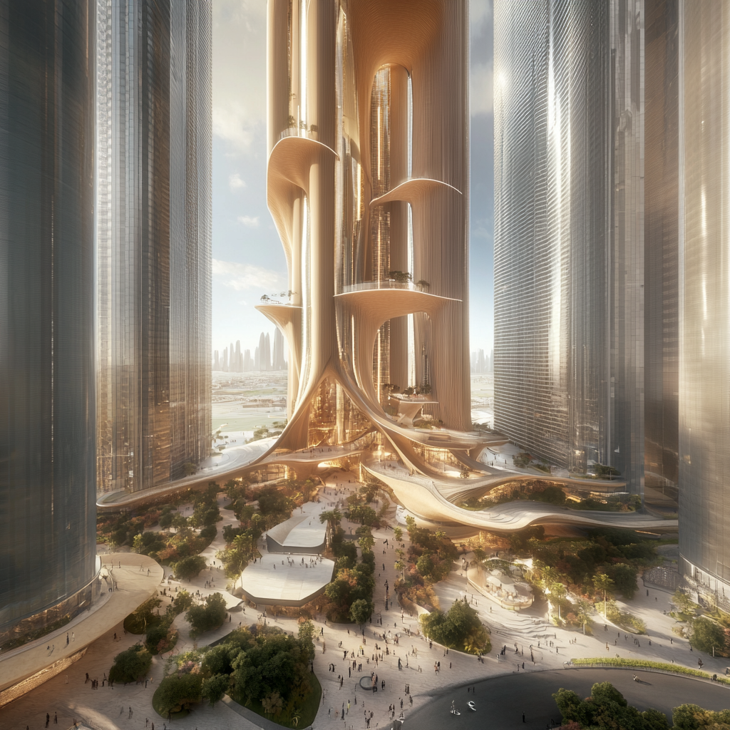 The tower’s fluid geometries are shaped by heat and wind, forming sky gardens, shaded enclaves, and open-air walkways that dissolve the boundary between structure and environment. Sightlines open, scents linger, sound is absorbed, and every surface invites interaction, creating a layered rhythm.